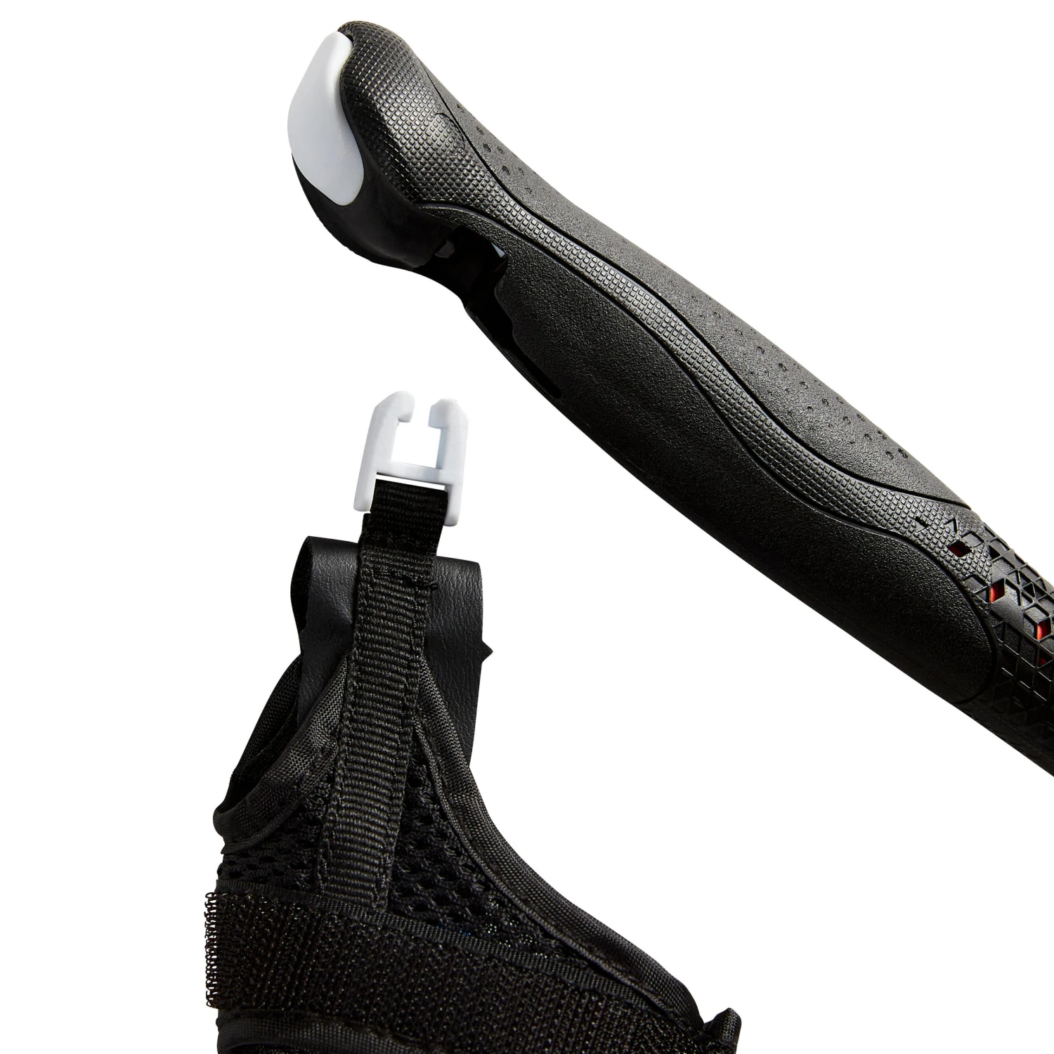 1. In order to more easily unmould the tips, the product used leaves a soft film on the inside.To avoid losing the tip, simply put a little dust inside to remove the oil and the tip will fit securely on the end.2. The attachment for fastening the gauntlet at the handle has a direction. There is a flat side and one side with bevelled angles.Always put the side with the bevelled angles upwards.Where should you put the gauntlets on your hands before clipping them to the pole?